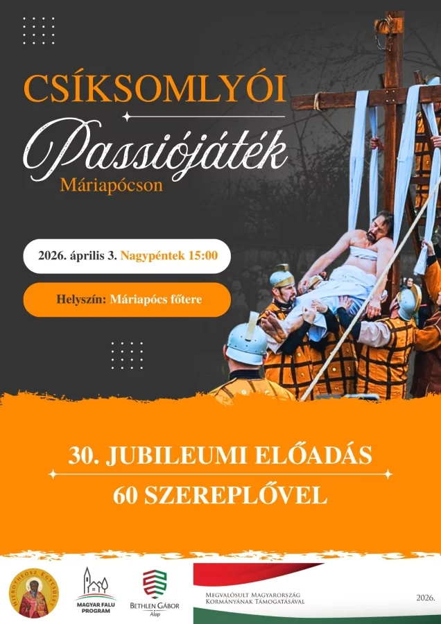 Ezúton ajánljuk figyelmükbe a 2026. április 3-án 15 órakor megrendezésre kerülő Csíksomlyói Passiójáték 30. jubileumi előadását, melynek helyszíne Máriapócs főtere a Kossuth tér.