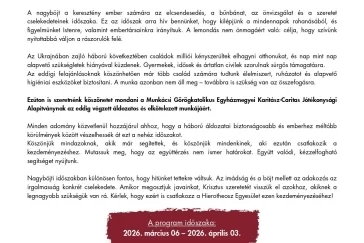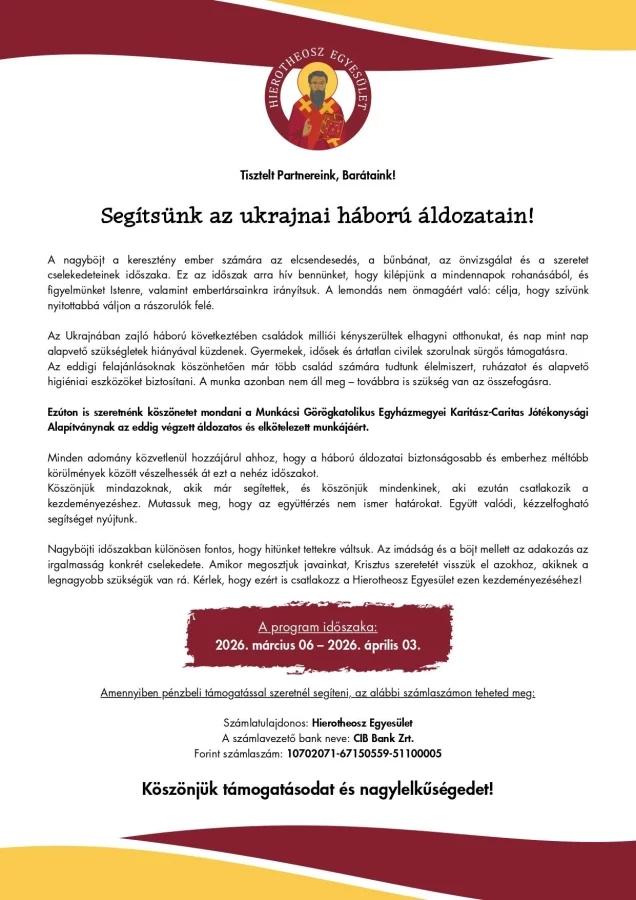 Nagyböjti időszakban különösen fontos, hogy hitünket tettekre váltsuk. Az imádság és a böjt mellett az adakozás az irgalmasság konkrét cselekedete. Amikor megosztjuk javainkat, Krisztus szeretetét visszük el azokhoz, akiknek a legnagyobb szükségük van rá. Kérlek, hogy ezért is csatlakozz a Hierotheosz Egyesület ezen kezdeményezéséhez!