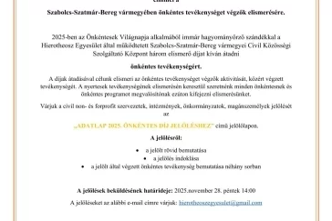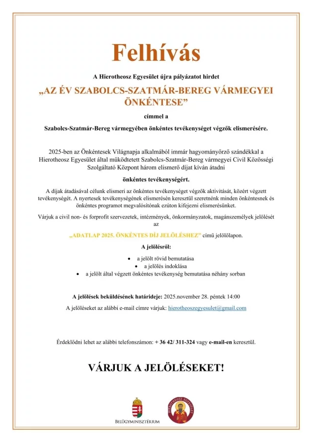 A Hierotheosz Egyesület újra pályázatot hirdet „AZ ÉV SZABOLCS-SZATMÁR-BEREG VÁRMEGYEI ÖNKÉNTESE” címmel a Szabolcs-Szatmár-Bereg vármegyében önkéntes tevékenységet végzők elismerésére.