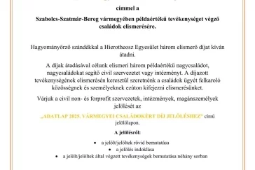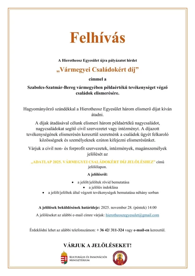 A Hierotheosz Egyesület újra pályázatot hirdet „VÁRMEGYEI CSALÁDOKÉRT" díj címmel a Szabolcs-Szatmár-Bereg vármegyében példaértékű nagycsalád, nagycsaládokat segítő civil szervezet vagy intézmény elismerésére.