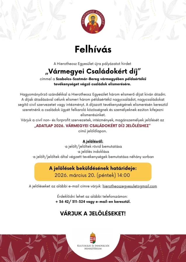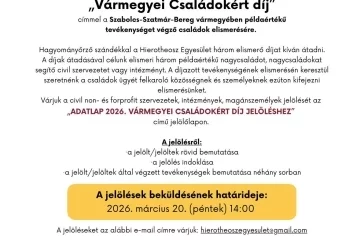 A Hierotheosz Egyesület újra pályázatot hirdet a „VÁRMEGYEI CSALÁDOKÉRT" díj címmel a Szabolcs-Szatmár-Bereg vármegyében példaértékű nagycsalád, nagycsaládokat segítő civil szervezet vagy intézmény elismerésére.